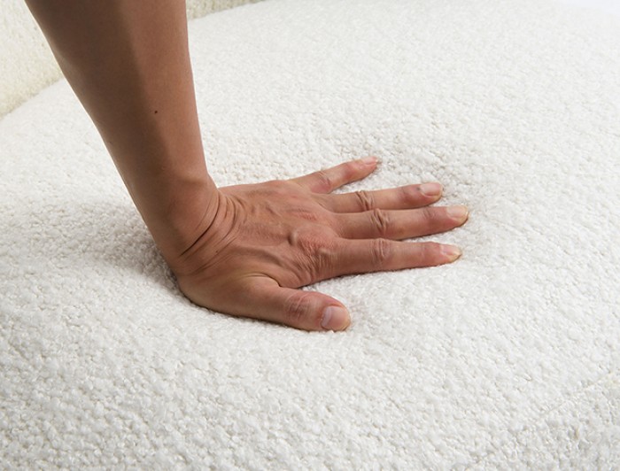 - Upholstered in Boucle Fabric